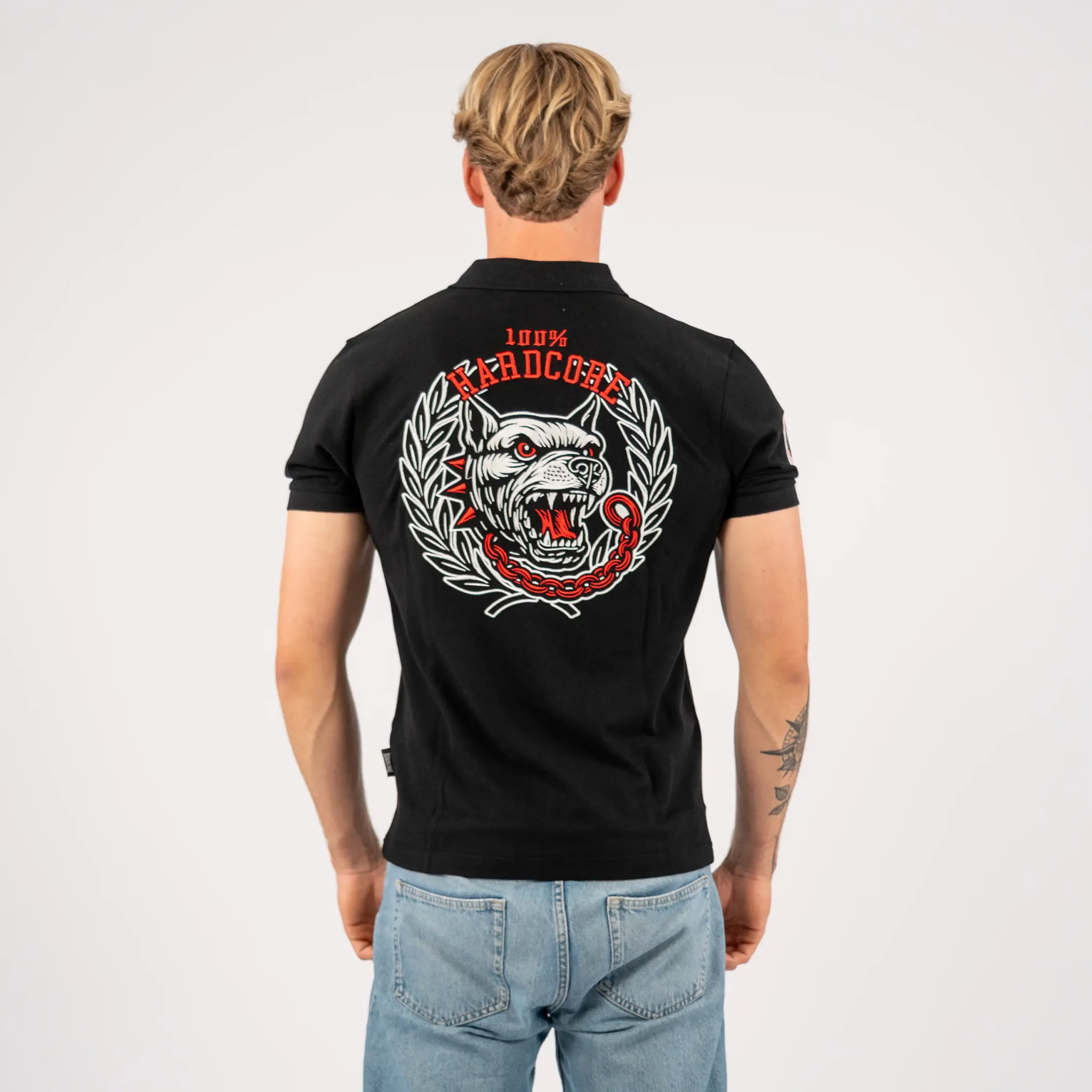 Dieses Poloshirt zeigt ein auffälliges besticktes Logo auf der Brust, ein detailliertes gewebtes Aufnäher am Ärmel und die ikonische, vollständige Unleashed-Hundestickerei auf dem Rücken. Eine saubere, aber kraftvolle Art, die Hardcore-Szene darzustellen.