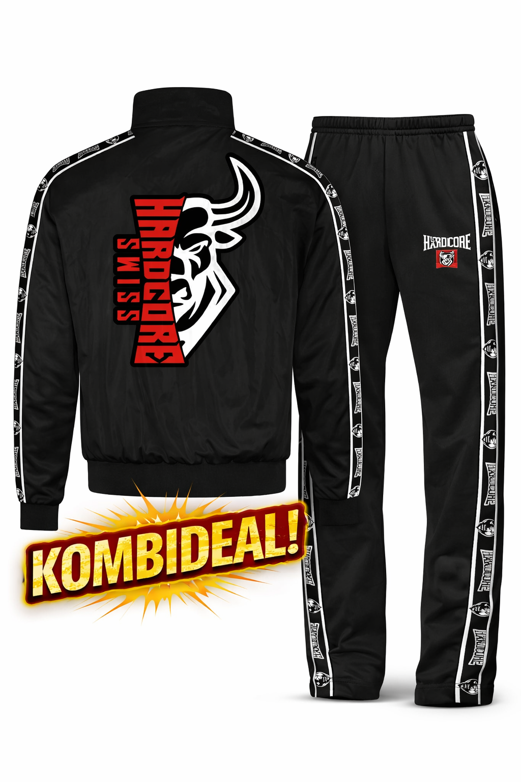 Hochwertige Swiss Hardcore & 100 % Hardcore Duo-Trainingsjacke inkl. Trainingshose als Specialpacking mit Paspelierung